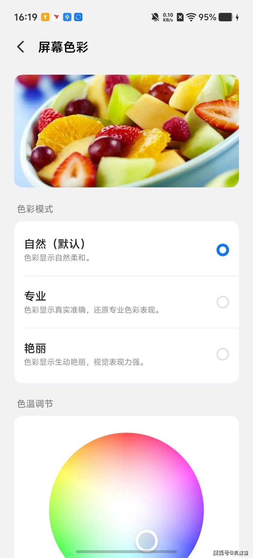 红魔只是一张普通贴膜,但没有彩虹纹,不影响屏幕正常显示,中规中矩不犯错。但红魔屏幕色彩也有点小问题,默认的鲜艳过艳,标准竟然和鲜艳差别不大,只是偏暖一点。