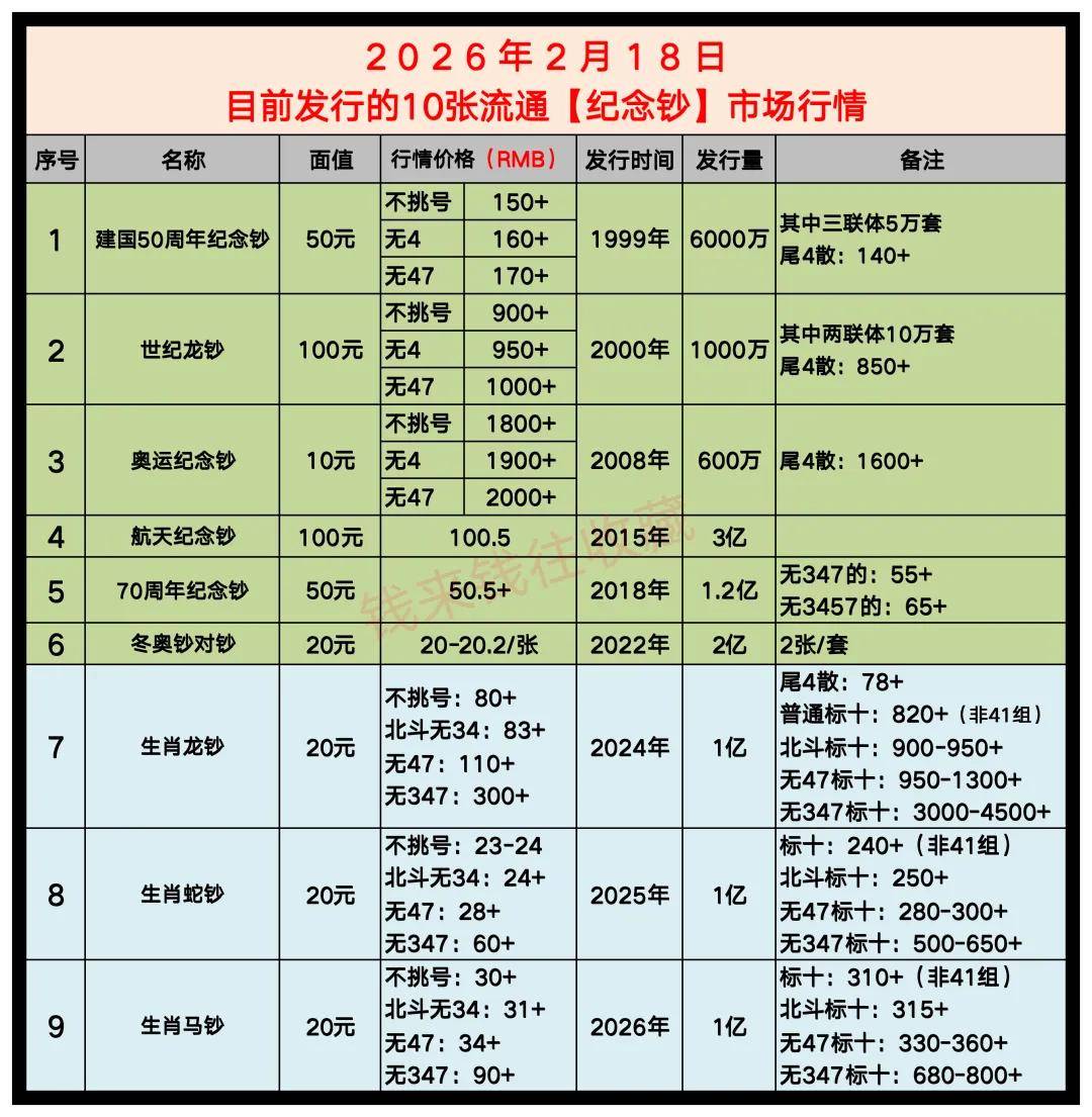 先跟大家说个整体大行情:2026年春节前后,纪念钞市场整体偏冷,呈现“老钞稳、新钞跌、生肖分化”的状态。简单说就是,早年发行的稀缺老钞(比如奥运钞、世纪龙钞)虽然有小幅回调,但整体抗跌;近几年发行的新钞(比如70周年钞、航天钞)基本在面值附近徘徊,没什么波动;生肖系列里,龙钞坚挺,蛇钞、马钞则出现了明显回落,大家心里先有个底。