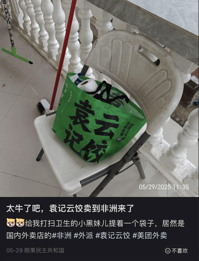 其实在非洲的街头,无论是被当作手提袋售卖的中国外卖保温袋,还是当地人身上那件熟悉的“饿了么”工服,这些看似零散的中国符号,都不会是偶然的个体行为。